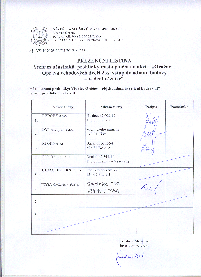 Název: "Oráčov - Oprava vchodových dveří 2ks, vstup do admin. budovy - vedení věznice"