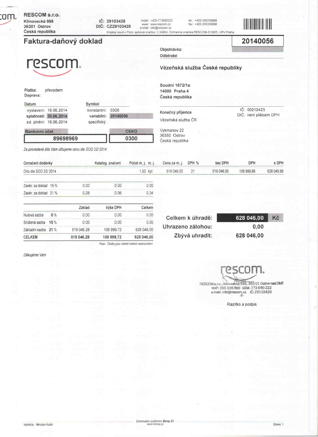 | Název: | výše skutečně uhrazené ceny - faktura č. 20140056 |